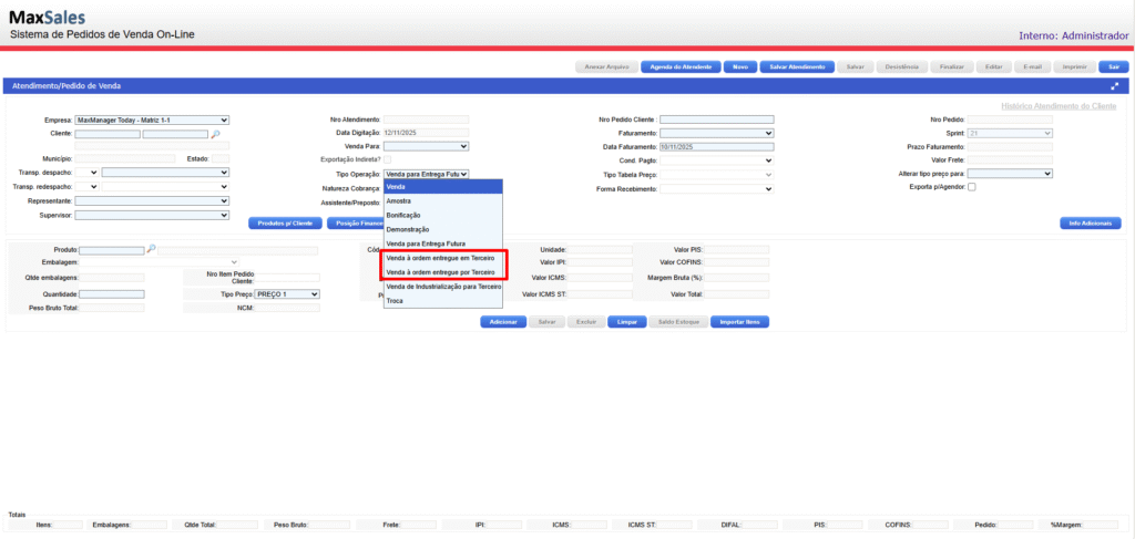 MaxSales > Pedidos de Venda > Novo