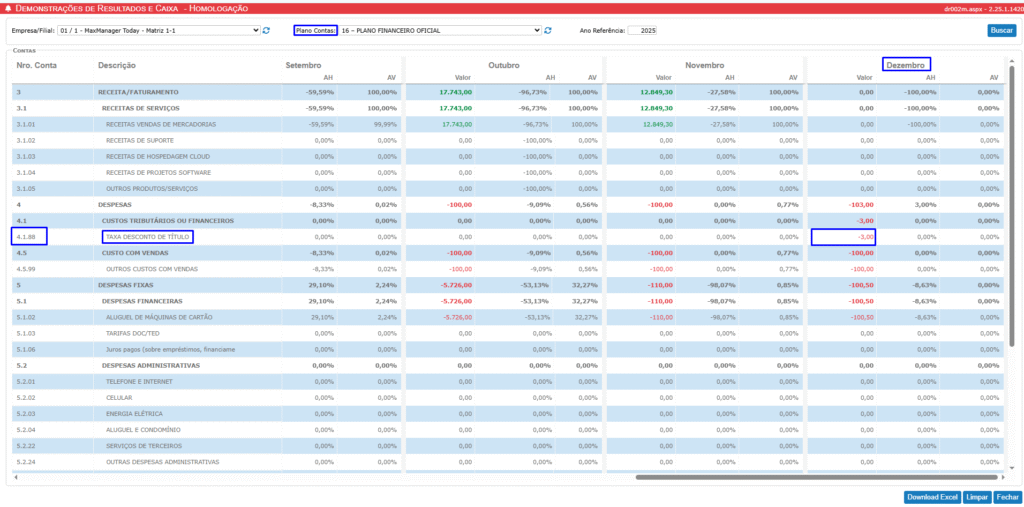 A partir da versão 2.25.1.14217 do MaxManager, corrigimos a forma como o sistema contabiliza as taxas de desconto de títulos a receber, garantindo a correta exibição desses valores no Demonstrativo de Resultado do Exercício (DRE).