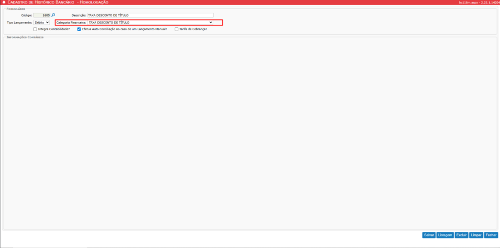 Para perfeito funcionamento será 🔸 importantes a configuração na tela Financeira > Bancos e Caixa > Cadastros > Cadastro de Histórico Bancário