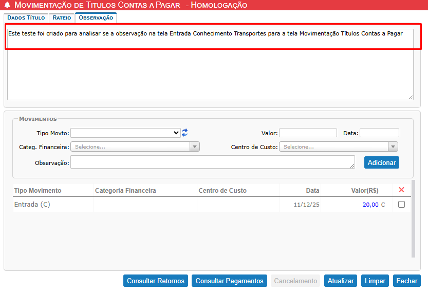 Com esta atualização, todas as informações registradas no campo “Observações” da tela Entrada Conhecimento Transportes (Suprimentos > Recebimento de Mercadorias > Movimentações > Entrada Conhecimento Transportes) passam a ser automaticamente levadas para o campo “Observação” do título correspondente na rotina Movimentação de Títulos Contas a Pagar (Financeira > Contas a Pagar > Movimentações > Movimentação de Títulos Contas a Pagar).