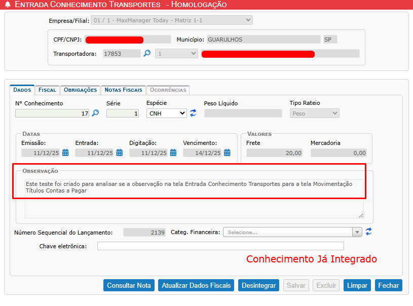 A partir da versão 2.25.1.14244 do MaxManager, o processo de integração do Conhecimento de Transporte (CT-e) foi aprimorado para garantir maior rastreabilidade e conformidade no fluxo financeiro.