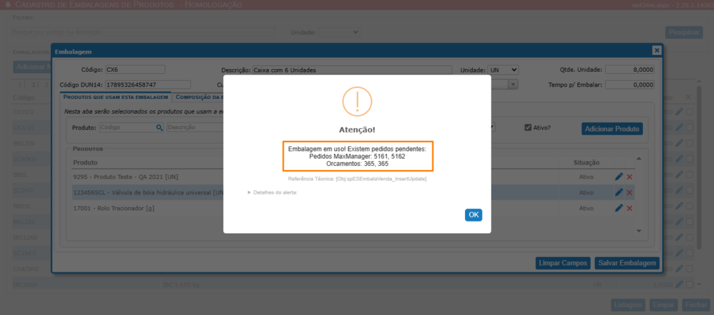 A partir da versão 2.25.1. do MaxManager, o sistema passou a apresentar uma validação mais clara ao tentar alterar a quantidade de uma embalagem de produto que já esteja vinculada a Pedidos de Venda e/ou Orçamentos ainda em aberto.