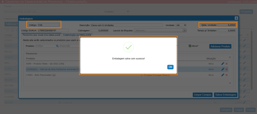 Caso não haja mais pedidos ou orçamentos vinculados (após cancelar, liquidar ou faturar), o cadastro da embalagem é realizado corretamente: