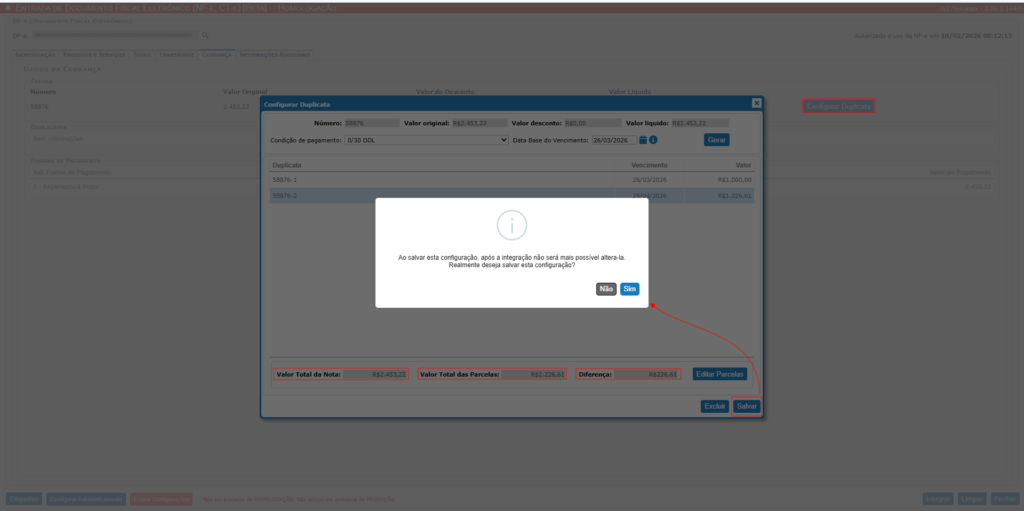 - Alerta de Divergência: Ao salvar as parcelas na aba “Cobrança”, o sistema valida se a somatória bate com o total da nota. Caso haja diferença, um alerta será exibido perguntando se você deseja prosseguir. Esse alerta ocorrerá caso o usuário clicar no botão “Configurar Duplicata” e realizar alterações de forma manual nas parcelas.